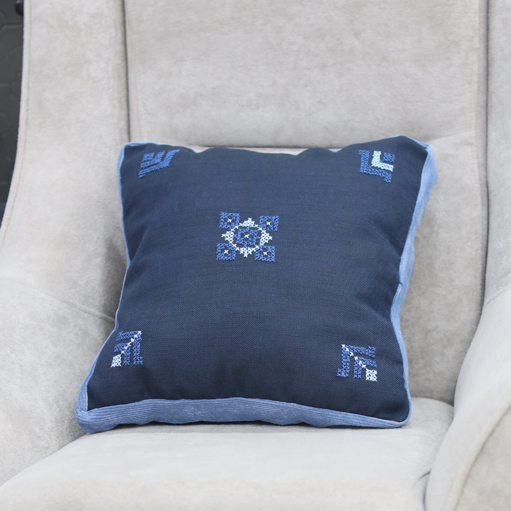Blue Pillow Cover is a great way to add a pop of color to your living space. Embroidered with a beautiful tatreez design, you can share your Palestinian heritage with all your guests. The tatreez designs embroidered on this pillow are pieces abstracted from the "Cow Eyes", "Maha" and "Feathers" tatreez motif.