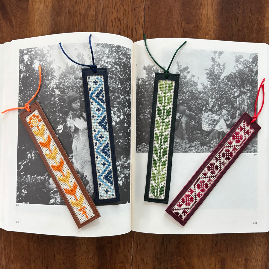 Our tatreez bookmarks are perfect way to add a little tatreez to your daily routine! Each bookmark is hand-embroidered with by refugee and low-income women artisans with a traditional Palestinian tatreez design.